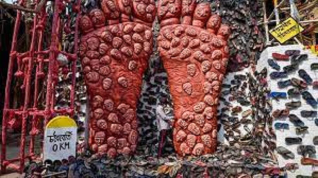 জুতা দিয়ে পূজা মণ্ডপ সাজিয়ে ‘ধর্মীয় ভাবাবেগে আঘাত’ হানা হয়েছে। এই অভিযোগে কলকাতার দমদম পার্ক ভারতচক্র পূজা কমিটিকে আইনি নোটিশ পাঠিয়েছেন এক আইনজীবী। খবর হিন্দুস্তান টাইমসের।