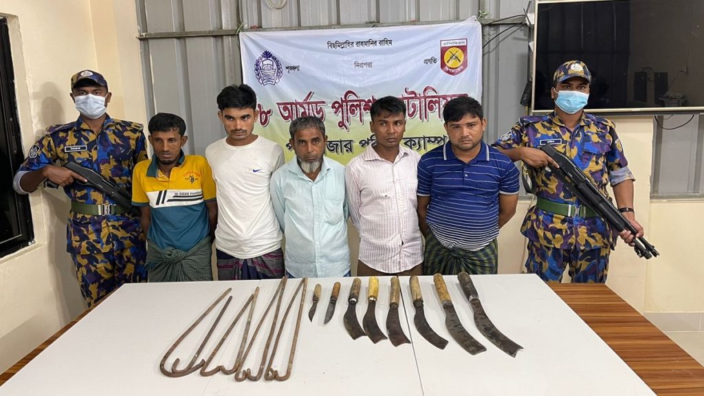 ৮ আর্মড পুলিশ ব্যাটালিয়ন অধিনায়ক মোহাম্মদ সিহাব কায়সার খান জানান, গোপন সূত্রে জানা যায় এফডিএমএন ক্যাম্প-০৯ এর কাঁচাবাজারের সামনের রাস্তার পাশের গলিতে ডাকাতি করার জন্য কয়েকজন রোহিঙ্গা প্রস্তুতি নিচ্ছে। উক্ত সংবাদের ভিত্তিতে পানবাজার পুলিশ ক্যাম্পের পুলিশ সদস্যরা ঐ স্থানে অভিযান পরিচালনা করে। অভিযানকালে পুলিশের উপস্থিতি টের পেয়ে দৌঁড়ে পালানোর সময় ওমর ফারুক (১৯), মুক্তার আহাম্মদ (৫০), মোহাম্মদ সলিম (৩৮), মো. আরাফাত (২৫) ও মনসুর আলম (২৫) কে আটক করে পুলিশ। এসময় তাদের কাছ থেকে ৬টি কাঠের বাটযুক্ত লোহার তৈরি দা, ২টি কাঠের বাটযুক্ত ছুরি ও ৮টি লোহার রডের তৈরি ডাকাতির সরঞ্জাম উদ্ধার করা হয়।