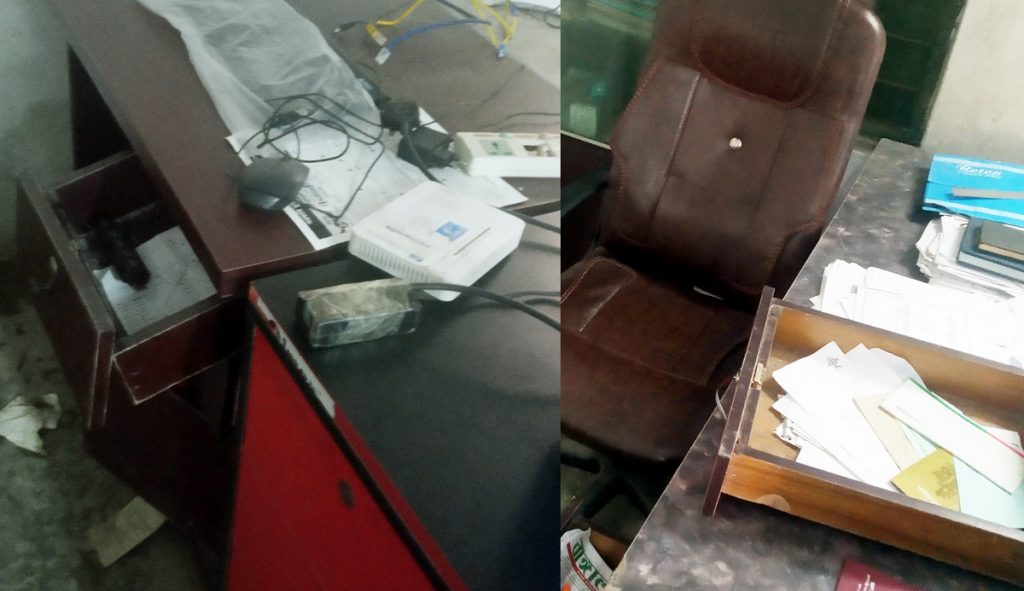 জানালাটি ভাঙ্গা। ভেতরে ঢুকে দেখি সবকিছু এলোমেলো, প্রতিটি টেবিলের ড্রয়ার ভেঙ্গে রাখা এবং ১টি ল্যাপটপ, দুটি কম্পিউটার, দুটি মনিটর ও কম্পিউটারের সাথে থাকা মডেম নেই। এছাড়াও অনেক প্রয়োজনীয় জিনিসপত্র নেই দেখতে পাই।