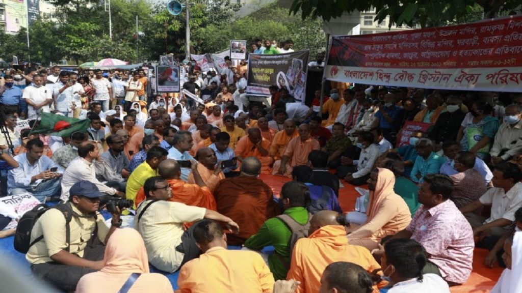 এর আগে শনিবার (২৩ অক্টোবর) শাহবাগে জাতীয় জাদুঘরের সামনে সকাল ছয়টা থেকে শুরু হয় হিন্দু-বৌদ্ধ-খ্রিস্টান ঐক্য পরিষদের পূর্বঘোষিত গণ অনশন, গণ অবস্থান ও বিক্ষোভ মিছিল। এতে সংহতি জানিয়ে অবস্থান নেয় বিভিন্ন সংগঠন। অবরোধ হয় শাহবাগ মোড়।