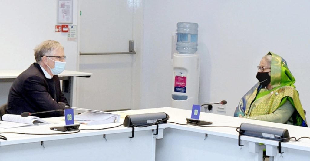 গ্লাসগোতে জলবায়ু সম্মেলন চলাকালে প্রধানমন্ত্রী শেখ হাসিনার সঙ্গে বৈঠক করেছেন টেক জায়ান্ট ও মাইক্রোসফটের প্রতিষ্ঠাতা বিল গেটস। সোমবার (১ নভেম্বর) স্কটল্যান্ডের গ্লাসগোতে বিশ্ব জলবায়ু সম্মেলন (কপ-২৬) কেন্দ্রের মিটিং রুমে এ সাক্ষাৎ হয়। এই বৈঠকে বাংলাদেশের সাথে আরও ঘনিষ্টভাবে কাজ করার আগ্রহ প্রকাশ করা হয় গেটস ফাউন্ডেশনের পক্ষ থেকে। বর্তমানে বাংলাদেশ অ্যাগ্রিকালচার রিসার্চ ইনস্টিটিউটের সঙ্গে কাজ করছে ফাউন্ডেশন। কাজের ক্ষেত্রে আরও বাড়াতে চায় তারা।