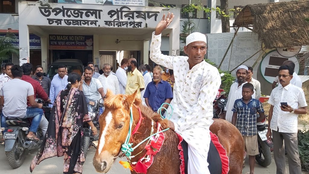 বৃহস্পতিবার বেলা ১১টা ৩০ মিনিট। উপজেলা পরিষদ সড়কের উপর দিয়ে কেউ একজন ঘোড়ায় চড়ে আসছেন। নায়কোচিত ভঙ্গিতে হাত নাড়ছেন রাস্তার পাশে দাঁড়িয়ে থাকা মানুষদের উদ্দেশে।