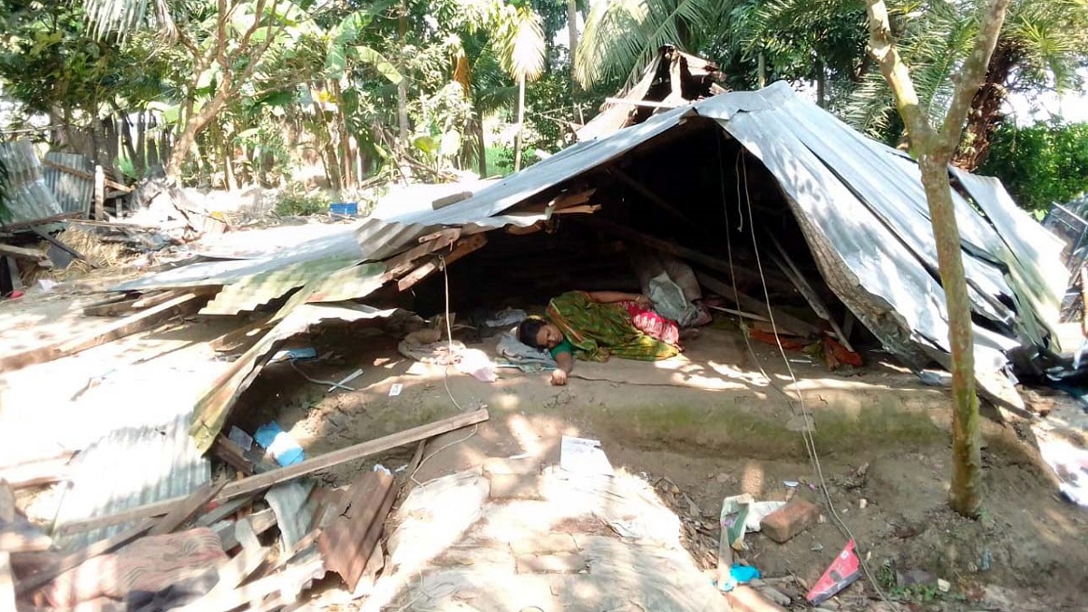 ভাঙচুর করা বাড়িতে আহত অবস্থায় শুয়ে আছেন গৃহকর্ত্রী।