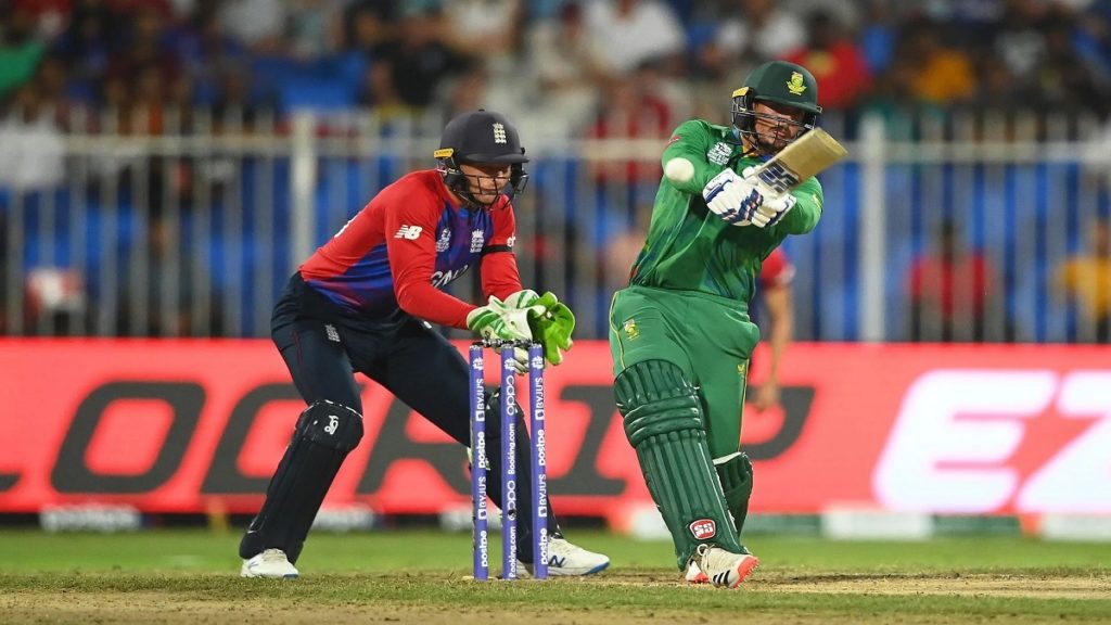 এর আগে, ব্যাট করতে নেমে ভ্যান ডসেনের ৯৪ এবং মার্করামের ৫২ রানে ভর করে ২০ ওভারে ২ উইকেট হারিয়ে ১৮৯ রান সংগ্রহ করেছে প্রোটিয়ারা। রিজা হেনড্রিক্সকে দলীয় ১৫ রানের মাথায় বোল্ড করে ইংল্যান্ডকে প্রত্যাশিত সূচনা এনে দেন মঈন আলী। ভ্যান ডার ডুসেনকে নিয়ে রানের গতি এগিয়ে নেয়ার চেষ্টা চালান প্রোটিয়া উইকেটরক্ষক ওপেনিং ব্যাটার কুইন্টন ডি কক। দ্বিতীয় উইকেট জুটিতে ইংলিশ বোলারদের বিরুদ্ধে আধিপত্য বজায় রেখে এ দুইজনের জুটিতে আসে ৫২ বলে ৭১ রান।