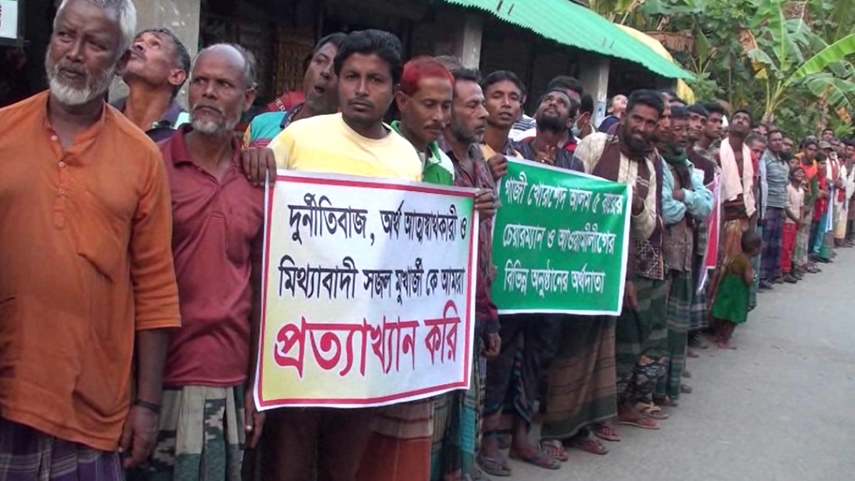 মানববন্ধনে বক্তারা বলেন, ধলবাড়িয়া ইউনিয়ন আওয়ামী লীগের প্রতিষ্ঠাতা সভাপতি ছিলেন গাজী খোরশেদ আলমের চাচা এলেমুদ্দীন গাজী। আওয়ামী লীগের সমর্থনে গাজী খোরশেদ আলম ৫ বার অর্থাৎ ২৫ বছর ধলবাড়িয়া ইউনিয়ন পরিষদের চেয়ারম্যান ছিলেন। গাজী খোরশেদ আলমের মৃত্যুর পর তারই ছেলে গাজী শওকাত হোসেন ২০০৩ সালে ও ২০১১ সালে আওয়ামী লীগের সমর্থন নিয়ে উপজেলা বিএনপির সভাপতিকে পরাজিত করে চেয়ারম্যান হন। তারই ধারাবাহিকতায় ২০১৬ সালে জননেত্রী শেখ হাসিনা গাজী শওকাত হোসেনকে আওয়ামী লীগের দলীয় মনোনয়ন দেন এবং তিনি বিপুল ভোটে বিএনপির প্রার্থীকে পরাজিত করে জয়ী হন। উপজেলা, জেলা ও কেন্দ্রীয় আওয়ামী লীগের মনোনয়ন বোর্ডের সিদ্ধান্ত মোতাবেক ২২ নভেম্বর গাজী শওকাত হোসেনকে পুনরায় আওয়ামী লীগের নৌকা প্রতীকের মনোনয়ন পান। কিন্তু সজল মুখার্জী মৌতলার রাজাকার খোরশেদ আলমকে গাজী শওকাত হোসেনের পিতা বলে চালিয়ে দিয়ে বিভিন্ন দফতরে তা দাখিল করে ও মানববন্ধনের মাধ্যমে গাজী শওকাত হোসেনের পরিবারকে হেয় করেছেন।