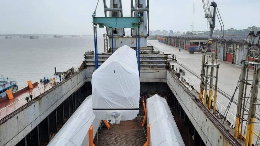 মোংলা বন্দরে চারটি বগি ও দুটি ইঞ্জিন নিয়ে আসা ঢাকা মেট্রোরেলের সরঞ্জাম আজ শনিবার সকালে বন্দর জেটির ৯ নম্বর জেটিতে খারাস শুরু হয়েছে। পানামা পতাকাবাহী ‘এম.ভি. ব্রাইটলি কোরাল’ জাহাজটি শুক্রবার রাতে মেট্রোরেলের চারটি বগি ও দুটি ইঞ্জিন নিয়ে মোংলা বন্দরে নোঙ্গর করে।