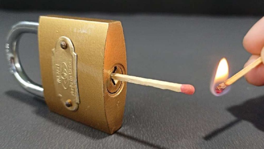 এ বার চাবি ঢোকানোর ওই ছিদ্রের মধ্যে আস্ত দেশলাই কাঠিটি ঢুকিয়ে দিতে হবে। মনে রাখতে হবে, দেশলাই কাঠির বারুদের অংশটি থাকবে বাইরের দিকে। এর পরে গোটা দেশলাই কাঠিটির বারুদে আগুন দিতে হবে। বারুদ জ্বলে যাওয়ার পরে আগুন আস্তে আস্তে কাঠির নীচের দিকে ছড়িয়ে পড়বে। এবং শেষে গিয়ে আগুনটি তালার ভিতরে সেই জায়গায় পৌঁছবে, যেখানে গুঁড়া বারুদ রয়েছে।