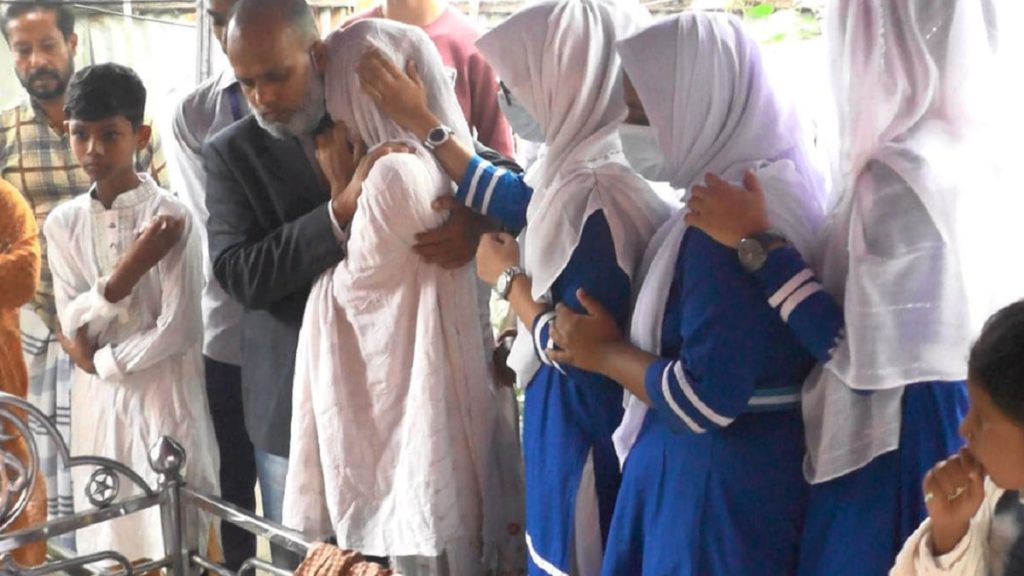 আজ রোববার (১৪ নভেম্বর) সকালে নরসিংদীর পলাশ উপজেলায় এই হৃদয়বিদারক ঘটনা ঘটে। সিনথিয়া কবির উপজেলার ঘোড়াশাল পৌর এলাকার জনতা আদর্শ বিদ্যাপীঠের ছাত্রী। ফজরের নামাজের পর সিনথিয়া কবিরের বাবা হুমায়ুন কবির মৃত্যুবরণ করেন। হুমায়ুন কবির উপজেলার ঘোড়াশাল পৌর এলাকার পলাশ কুটিরপাড়া গ্রামের মৃত মোখলেছ সরদারের ছেলে। নিহতের স্বজনরা জানান, হুমায়ুন কবির হার্ট অ্যাটাক করে ভোরে নিজ বাড়িতে মৃত্যুবরণ করেন।