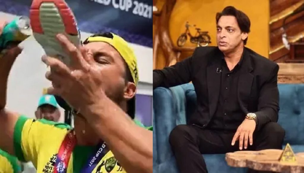অস্ট্রেলিয়ান ড্রেসিংরুমের উদযাপনের একটি ভিডিও আইসিসি তার অফিসিয়াল ইনস্টাগ্রাম অ্যাকাউন্ট থেকে শেয়ার করেছে। ওই ভিডিওতে দেখা যায়, ম্যাথু ওয়েড তার জুতো খুলে তাতে মদ ঢেলে তা গিলে ফেলেন। এরপর মার্কাস স্টোইনিস তার কাছ থেকে জুতোটি নিয়ে তাতে মদ ঢেলে তিনিও পান করতে থাকেন। এমন উদযাপনে রীতিমতো বিরক্ত হয়ে টুইটারের মাধ্যমে ক্ষোভ প্রকাশ করেন সাবেক পাকিস্তানি বোলার শোয়েব আখতার। এক টুইট বার্তায় শোয়েব আখতার লিখেছেন, ‘উদযাপনের জঘন্য একটি উপায়। তাই না?’