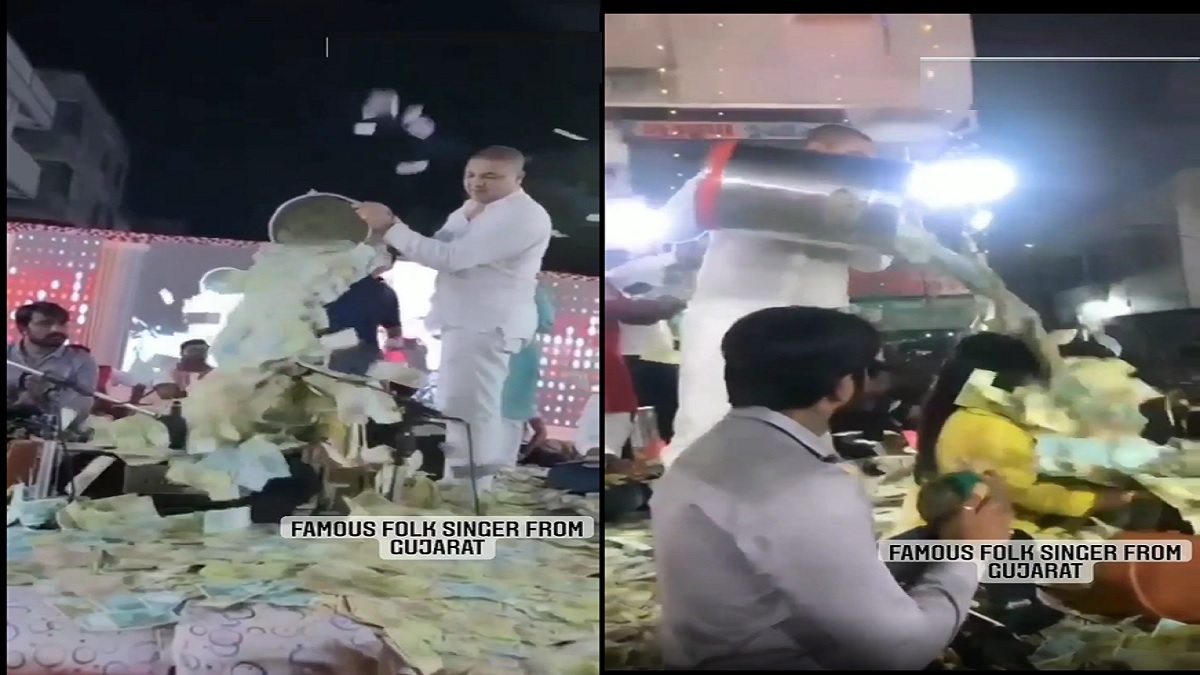 হারমোনিয়াম বাজিয়ে গান পরিবেশন করছিলেন গুজরাটি গায়িকা উর্বশী রাড্ডিয়া। আচমকা পেছন থেকে একজন বালতিভর্তি টাকা তার মাথায় ঢেলে দেন। এই দৃশ্য সামাজিক যোগাযোগ মাধ্যমে প্রকাশের পর রীতিমতো ভাইরাল।