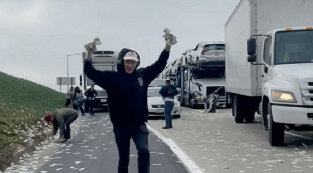 California drivers stop their cars on the freeway and go nuts as cash falls from armored vehicle. Highway Patrol warning drivers if they don’t turn the money in, “they could be facing charges”. pic.twitter.com/TukNPyJtRg