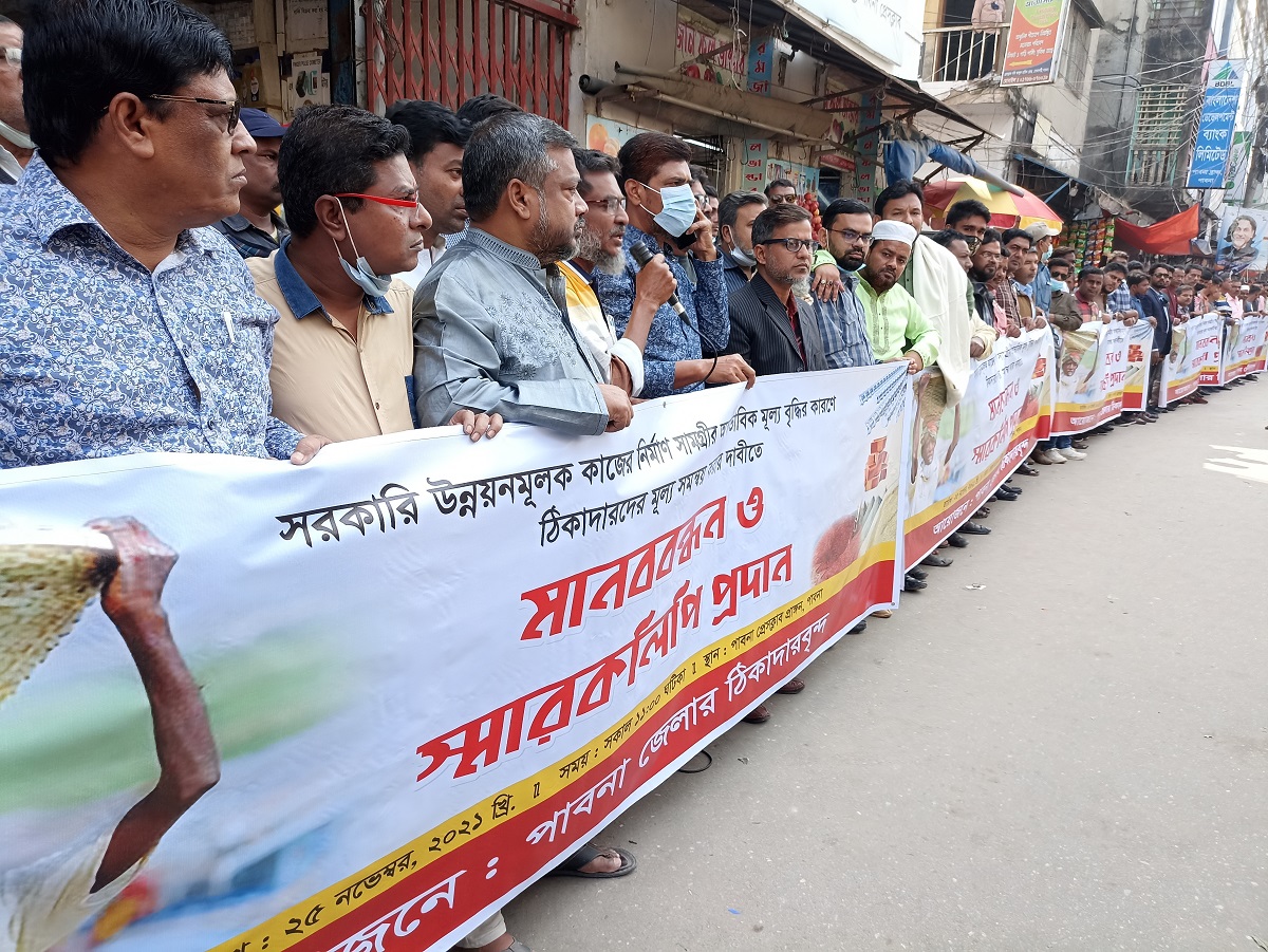 সরকারি উন্নয়নমূলক কাজের নির্মাণ সামগ্রীর অস্বাভাবিক মূল্য বৃদ্ধির কারণে ঠিকাদারদের মূল্য সমন্বয় করার দাবিতে মানববন্ধন ও স্মারকলিপি প্রদান করেছে পাবনা ঠিকাদার সমিতির সদস্যবৃন্দ।
