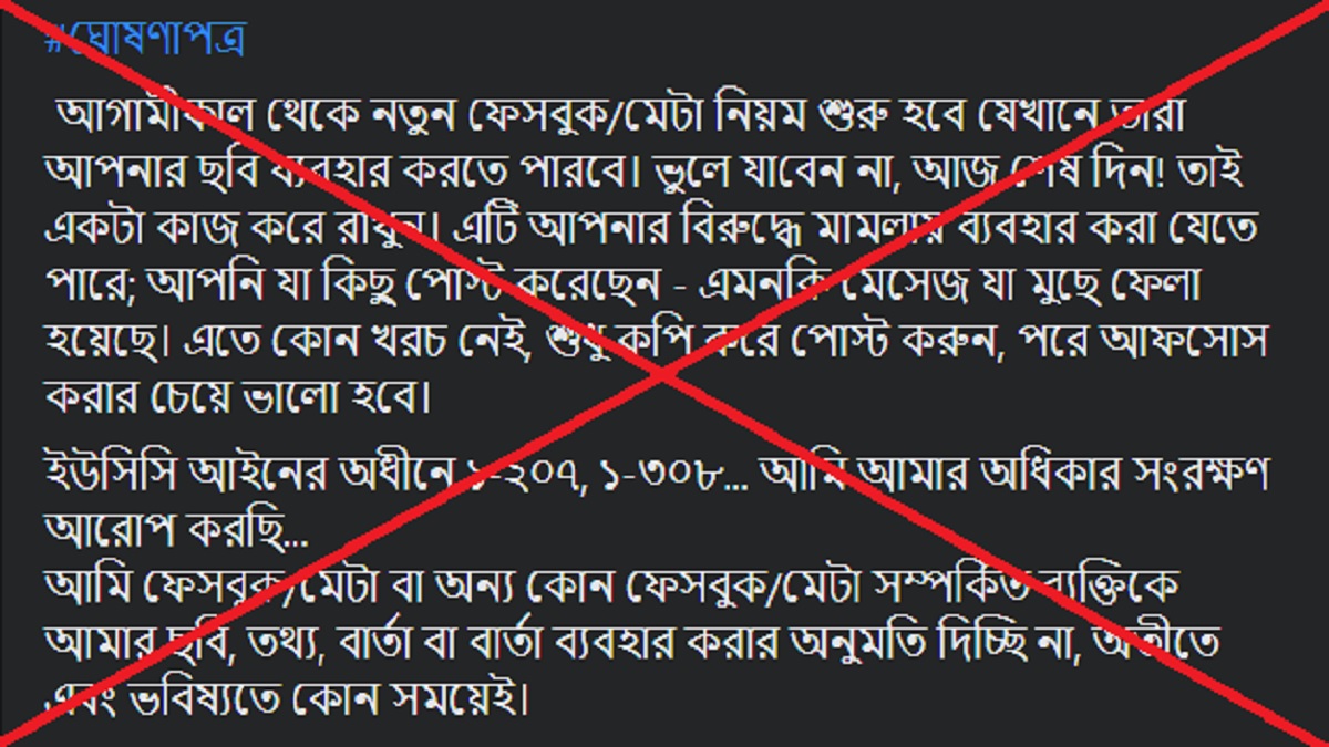 সামাজিক যোগাযোগ মাধ্যম ফেসবুকে অনেককেই একটি পোস্ট শেয়ার করতে দেখা যাচ্ছে যে, ফেসবুকের মূল প্রতিষ্ঠান মেটা কর্তৃক প্রণীত নতুন নীতিমালা অনুযায়ী ফেসবুক ব্যবহারকারীদের যেকোনো তথ্য অবাধে ব্যবহারের সুযোগ পাবে প্রতিষ্ঠানটি। এমনকি মুছে ফেলা মেসেজও বিনা অনুমতিতে ব্যবহার করতে পারবে তারা। ফেসবুকের একজন মুখপাত্রের বরাতে এএফপি জানিয়েছে, এ বার্তাটি গুজব ও ভুয়া।