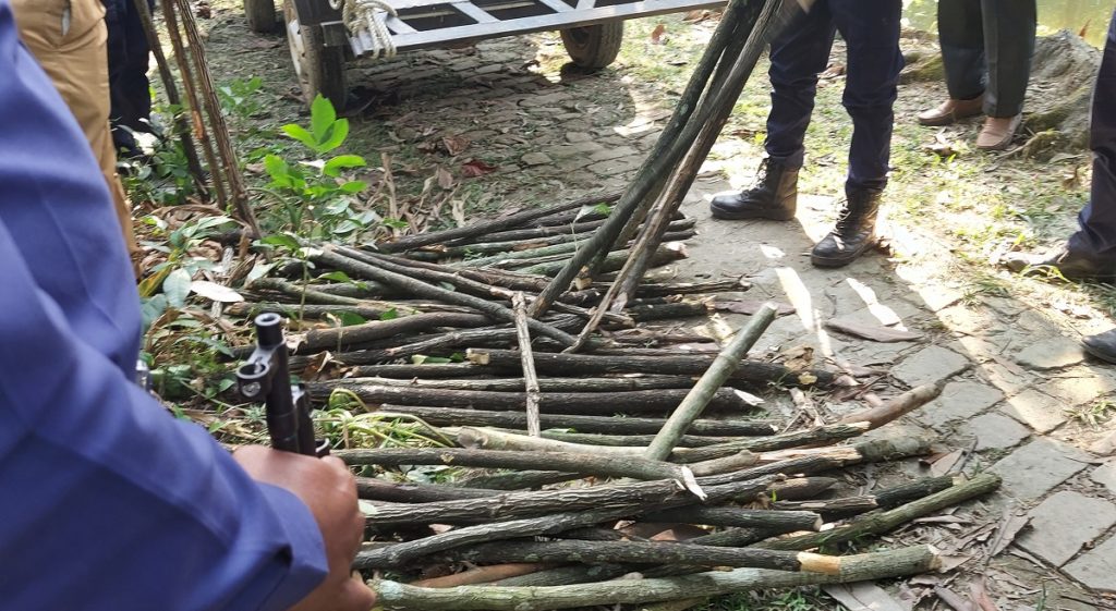 শাহিন মাহমুদ জানান, গোপন সংবাদের ভিত্তিতে দুপুরে পুলিশ নিয়ে ওই বাগানে তল্লাশি চালানো হয়। এক পর্যায়ে পুকুরের পাড়ের বাগান থেকে লাঠিগুলো উদ্ধার করা হয়। বাগান থেকে ছোট ছোট গাব গাছ কেটে এগুলো মজুদ করা হয়েছিল। আজ ভোটের সময় কেন্দ্র দখল কিংবা কেন্দ্রের বাইরে মারামারি করার লক্ষ গতকাল রাতে এগুলো মজুত করে রাখতে পারে বলে তার ধারনা।
