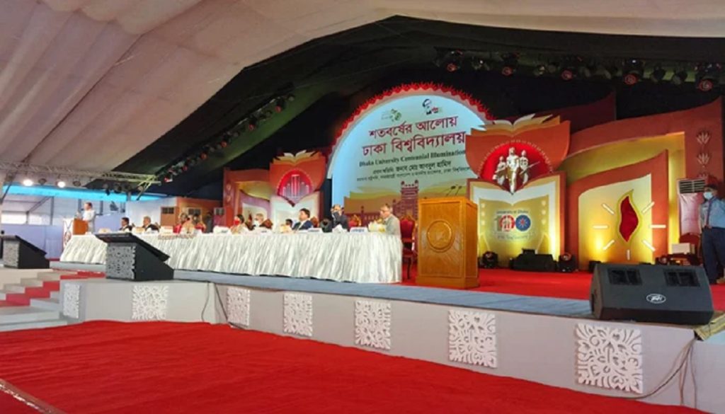 শতবর্ষ উপলক্ষে ঢাকা বিশ্ববিদ্যালয়ের কেন্দ্রীয় খেলার মাঠে বুধবার দিনভর ছিল নানা আয়োজন। প্রথম উদ্বোধনী পর্ব, দ্বিতীয়টি আলোচনা সভা ও সাংস্কৃতিক অনুষ্ঠান। শতবর্ষের উদ্বোধনী অনুষ্ঠানে ঢাকা বিশ্ববিদ্যালয়ের আচার্য ও রাষ্ট্রপতি মো. আবদুল হামিদ ভার্চুয়ালি যুক্ত হয়ে প্রধান অতিথির বক্তব্য দেন। করোনা পরিস্থিতির কারণে পাঁচ মাস দেরিতে ঢাকা বিশ্ববিদ্যালয়ের শতবর্ষ ও স্বাধীনতার সুবর্ণজয়ন্তীর অনুষ্ঠান হচ্ছে।