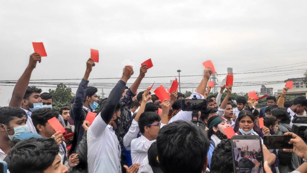 সড়কে অনিয়ম ও নিরাপদ সড়কের দাবিতে সরকারকে লাল কার্ড দেখালো নিরাপদ সড়ক আন্দোলনের ব্যানারের শিক্ষার্থীরা। জানান, দাবি পূরণ না হওয়া পর্যন্ত শিক্ষার্থীরা ধারাবাহিকভাবে আন্দোলন চালিয়ে যাবে।