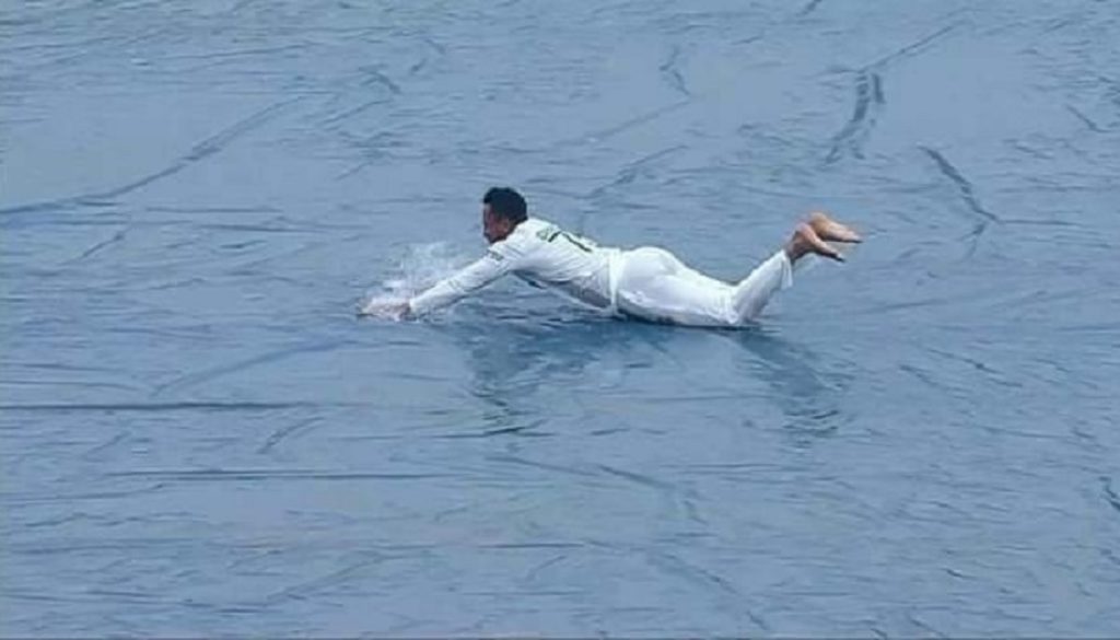 ইনডোর থেকে ড্রেসিংরুমে ফিরছিলেন। কী মনে করে দিলেন ভোঁ দৌড়। গুঁড়ি গুঁড়ি বৃষ্টি পড়ছিল তখন। মাঠ কাভার দিয়ে ঢাকা। কাভারের কাছে আসতেই দিলেন স্লাইড। এক ডাইভে এপার থেকে যেন ওপার। পুরো শরীরর ভাসালেন কাভারের পানিতে। মুখে অনাবিল আনন্দ। বোঝা যাচ্ছিল বৃষ্টির ওই পানিতে শুধু শরীরই নয়, ভিজেছিল তার অন্তর। হৃদয় নিংড়ানো হাসিতে হৃদয়কেও নাড়িয়ে দেয় সেই মুহূর্ত।