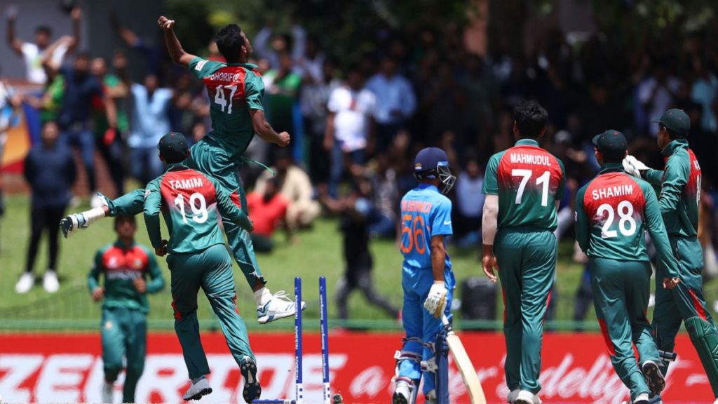 ভারতের ইডেন গার্ডেনে টস হেরে ব্যাট করতে নেমে ব্যর্থ হয় বাংলাদেশের টপ অর্ডার। ২৮ রান তুলে সাজঘরে ফেরেন নওরোজ প্রান্তিক। এরপর আইচ মোল্লা ও আশিকুর জামানের ব্যাটে ২৩৪ রানের চ্যালেঞ্জিং সংগ্রহ গড়ে বাংলাদেশ। ৯৩ রানের মাথায় রান আউটে হয়ে সেঞ্চুরি হাতছাড়া করেন আইচ মোল্লা। আর হাফ সেঞ্চুরি তুলে নেন আশিকুর জামান।