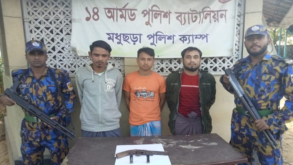 ১৪ আমর্ড পুলিশ ব্যাটালিয়ন মধুরছড়া ক্যাম্পের সদস্যরা সোমবার (১৩ ডিসেম্বর) ভোররাতে ক্যাম্প-৪, ব্লক-ই-১৪ এর জোবায়ের মোহাম্মদের বসতঘর থেকে তাদেরকে আটক করে। আটককৃতরা হচ্ছেন জোবায়ের মোহাম্মদ (২২), মো. আয়াছ (২২) ও আয়াত উল্লাহ (২৫)।