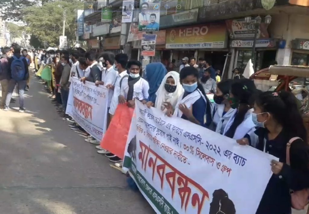 তাই পুরো সিলেবাস থেকে ৭০ ভাগ কমিয়ে ৩০ ভাগ রাখার দাবি তাদের। দাবি আদায়ে সকাল ১১টা থেকে দুপুর ১২টা পর্যন্ত শহরের পৌরসড়কে মানববন্ধন ও বিক্ষোভ করে শিক্ষার্থীরা। এ সময় সড়কে যানজটের সৃষ্টি হয়। খবর পেয়ে নেত্রকোণা মডেল থানার পুলিশ গিয়ে