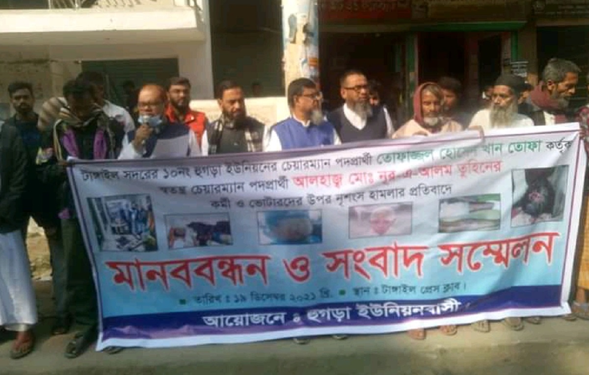টাঙ্গাইল সদর উপজেলার হুগড়া ইউনিয়নের স্বতন্ত্র চেয়ারম্যান পদপ্রার্থী মো. নূর-এ-আলম তুহিনের কর্মী ও ভোটারদের উপর নৃশংস হামলার প্রতিবাদে মানববন্ধন অনুষ্ঠিত হয়েছে। তাদের অভিযোগ, এ হামলার পেছনে আছেন একই ইউনিয়নের চেয়ারম্যান পদপ্রার্থী তোফাজ্জল হোসেন।