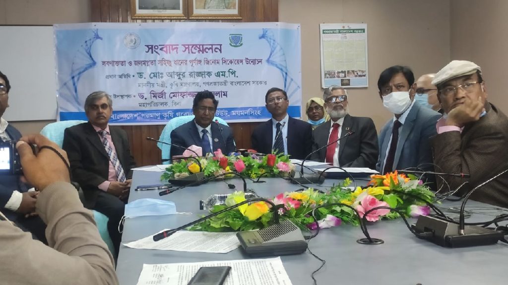 বাংলাদেশে এই প্রথম লবণাক্ততা ও জলমগ্নতা সহিষ্ণু ধানের পূর্ণাঙ্গ জিনোম সিকোয়েন্স উন্মোচন করা হয়েছে বলে জানিয়েছেন কৃষিমন্ত্রী ড. আবদুর রাজ্জাক। বৃহস্পতিবার (২৩ ডিসেম্বর) বাংলাদেশ পরমাণু কৃষি গবেষণা ইনস্টিটিউট (বিনা) কনফারেন্স রুমে আয়োজিত সংবাদ সম্মেলনে তিনি এ তথ্য জানান।