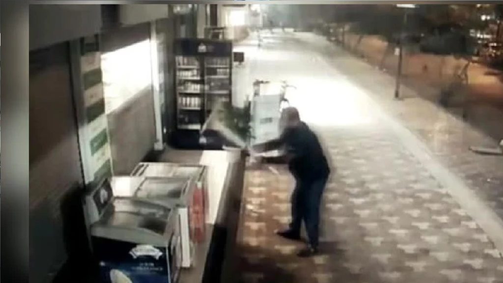 আইসক্রিমক্রেতা দোকানির সাথে কথা বলার সময় ধাতব একটি ফ্রেম দু’হাতে উঁচু করে ধরেন। এরপর তিনি সেটা দিয়ে উপুর্যপুরি আইসক্রিম রাখা ফ্রিজে সাজারো আঘাত করেন। পরপর তিনটি ফ্রিজ তিনি এভাবে আঘাত করে ভেঙে ফেলেন। এরপর ধাতব বস্তুটি ফেলে দিয়ে রাগান্বিতভাবে চলে যান।