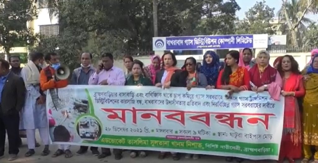 ব্রাহ্মণবাড়িয়ায় বাসাবাড়িতে নিরবিচ্ছিন্ন গ্যাস সরবরাহ নিশ্চিত এবং অবৈধ সংযোগ বিচ্ছিন্ন করে নতুন করে বৈধ গ্যাস সংযোগ প্রদানের দাবিতে মানববন্ধন ও বিক্ষোভ মিছিল অনুষ্ঠিত হয়েছে। মঙ্গলবার (২৮ ডিসেম্বর) সকাল সাড়ে ৯টায় ব্রাহ্মণবাড়িয়া শহরের ঘাটুরাস্থ বাখরাবাদ গ্যাস ডিস্ট্রিবিউশন কোম্পানি লিমিটেড কার্যালয়ের সামনে এ কর্মসূচি পালিত হয়। ব্রাহ্মণবাড়িয়াবাসীর পক্ষে সদর উপজেলা পরিষদের সাবেক মহিলা ভাইস চেয়ারম্যান অ্যাডভোকেট তাসলিমা সুলতানা খানম নিশাত এ কর্মসূচির আয়োজন করেন।