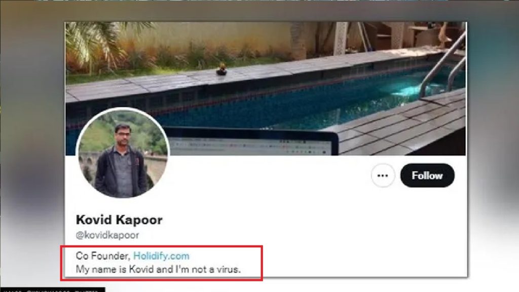 কোভিড নামের কারণে অনলাইনে অনেকবার আক্রমণের শিকার হয়েছেন ভারতীয় এ যুবক। অনেকেই তাকে ‘ভাইরাস’ বলে কটাক্ষ করেছেন। তাই তাদের উদ্দেশে শাহরুখ খানের ‘মাই নেম ইজ খান’ সিনেমার সংলাপের ঢঙে তিনি টুইটারে লিখেছেন, ‘মাই নেম ইজ কোভিড অ্যান্ড আই অ্যাম নট এ ভাইরাস’ অর্থাৎ ‘আমার নাম কোভিড এবং আমি ভাইরাস নই।’