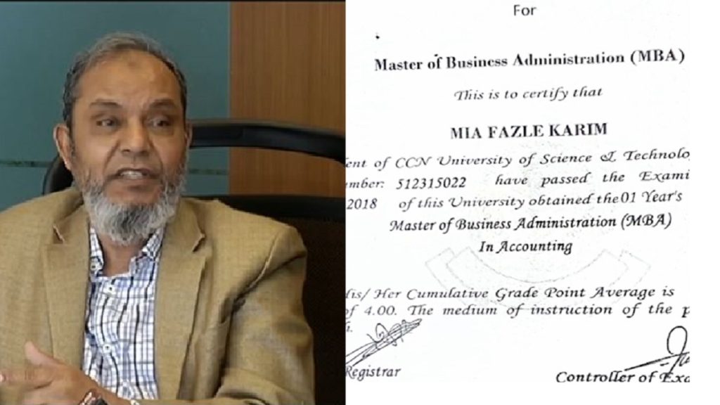 ফজলে করিমের জমা দেয়া এমবিএ কোর্সের সনদটি ছিল কুমিল্লার সিসিএন ইউনিভার্সিটি অব সায়েন্স অ্যান্ড টেকনোলজির। যমুনা নিউজকে ওই বিশ্ববিদ্যালয় কর্তৃপক্ষ জানিয়েছে, মিয়া ফজলে করিম নামে কেউ-ই শিক্ষাপ্রতিষ্ঠানটির ওই কোর্সের শিক্ষার্থী ছিলেন না।