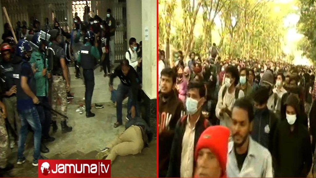 উত্তপ্ত পরিস্থিতি নিয়ন্ত্রণে আনতে ক্লাস-পরীক্ষা বন্ধ ঘোষণা করে বিশ্ববিদ্যালয় কর্তৃপক্ষ। দুপুর ১২টার মধ্যে আবাসিক শিক্ষার্থীদের দেয়া হয় হল ছাড়ার নির্দেশনা। কিছু ছাত্র-ছাত্রী হল ছেড়ে গেলেও নির্দেশনা মানেনি বেশিরভাগ শিক্ষার্থীই। যমুনা টিভির কাছে একজন ছাত্রী বলেন, আমাদের ভয় দেখানোর জন্য ওয়ারেন্টের কথা বলা হচ্ছে, হলের ভেতরে রেইড দেয়ার কথা বলা হয়েছে, মহিলা পুলিশ দিয়ে পেটানোর কথাও বলা হয়েছে। আমাদের বিভিন্নভাবে দাবিয়ে রাখার চেষ্টা করা হয়েছে।