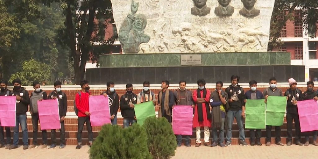 বুধবার (১৯ জানুয়ারি) বেলা সাড়ে ১১টায় বিশ্ববিদ্যালয়ের শহীদ বুদ্ধিজীবী চত্বরে অনুষ্ঠিত মানববন্ধনে এ দাবি তোলেন আন্দোলনকারীরা। মানববন্ধনে ছাত্র অধিকার পরিষদ, ছাত্র ফেডারেশনসহ বিভিন্ন সংগঠনের নেতাকর্মীসহ শতাধিক সাধারণ শিক্ষার্থী উপস্থিত ছিলেন।