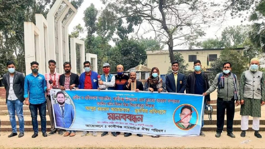 রোবববার (২৩ জানুয়ারি) দুপুরে কালীগঞ্জ সাংবাদিক ঐক্য পরিষদের উদ্যোগে উপজেলার কেন্দ্রীয় শহীদ মিনার চত্বরে এ মানববন্ধন অনুষ্ঠিত হয়।