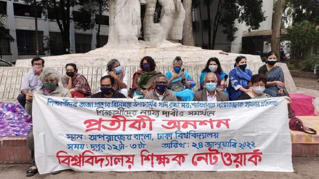 প্রতীকী এই অনশনে অংশ নিয়েছেন জাহাঙ্গীরনগর বিশ্ববিদ্যালয়ের অর্থনীতি বিভাগের অধ্যাপক আনু মোহাম্মদ, নৃবিজ্ঞান বিভাগের সাবেক অধ্যাপক রেহনুমা আহমেদ, ঢাকা বিশ্ববিদ্যালয়ের অর্থনীতি বিভাগের সহকারী অধ্যাপক ড. রুশাদ ফরিদী, পদার্থ বিজ্ঞান বিভাগের সহকারী অধ্যাপক ড. মো. কামরুজ্জামান, অ্যাকাউন্টিং অ্যান্ড ইনফরমেশন সিস্টেমস বিভাগের সহযোগী অধ্যাপক মোশাহিদা সুলতানা ঋতু, আন্তর্জাতিক সম্পর্ক বিভাগের অধ্যাপক তানজিম উদ্দিন খান, সমাজবিজ্ঞান বিভাগের সহযোগী অধ্যাপক সামিনা লুৎফা, গণযোগাযোগ ও সাংবাদিকতা বিভাগের সহযোগী অধ্যাপক কাজলি শেহরীন ইসলাম, ইংরেজি বিভাগের সহযোগী অধ্যাপক তাসনীম সিরাজ মাহবুব, জাহাঙ্গীরনগর বিশ্ববিদ্যালয়ের নৃবিজ্ঞান বিভাগের অধ্যাপক সাইদ ফেরদৌস এবং অধ্যাপক মীর্জা তসলিমাসহ আরও অনেকে।