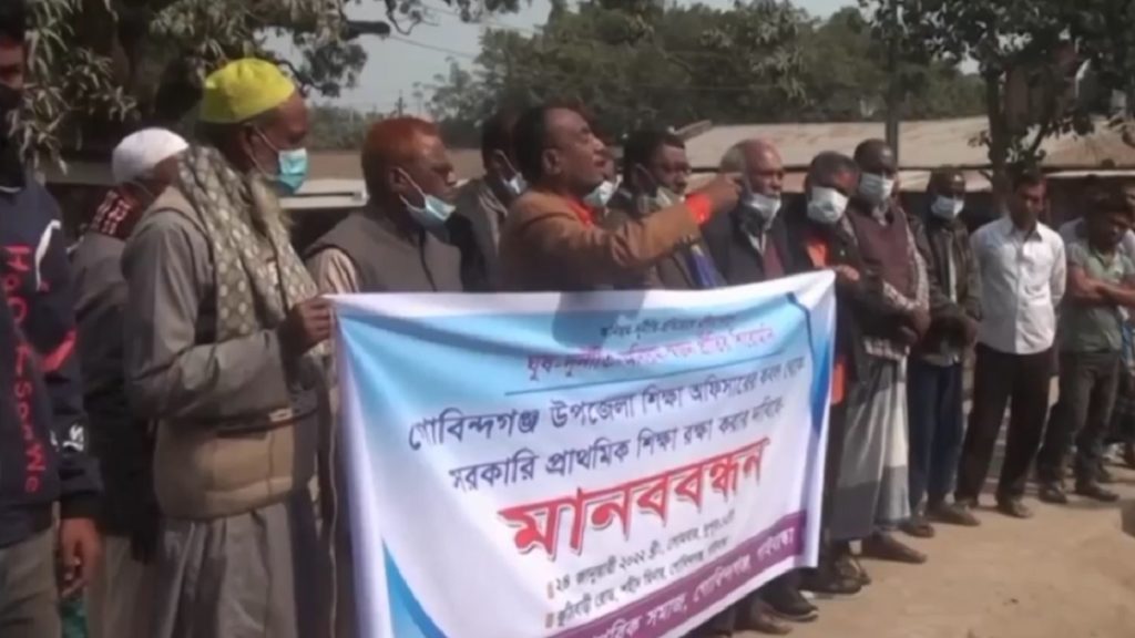 গাইবান্ধার গোবিন্দগঞ্জ উপজেলা প্রাথমিক শিক্ষা অফিসার মো. রমজান আলীর বিরুদ্ধে নানা অনিয়ম-দুর্নীতির প্রতিবাদে মানববন্ধন করেছে ভুক্তভোগীসহ এলাকাবাসী।