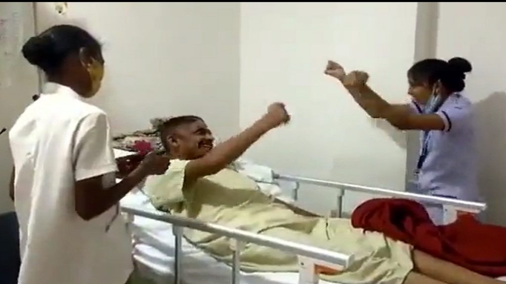 নিমিষেই ভাইরাল হয়ে যায় ভিডিওটি। নন্দিনী ভেঙ্কট নামে এক ব্যক্তি ভিডিওটি প্রথম শেয়ার করেন। ভিডিওতে দেখা যাচ্ছে, রোগীর সামনে প্রথমে নিজে নাচতে শুরু করেন একজন নার্স। তা দেখে উৎসাহিত হয়ে এক হাত তুলে নাচার চেষ্টা করেন ওই রোগী।