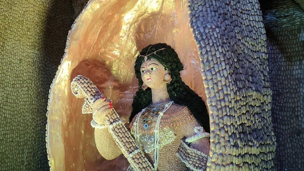 সরেজমিনে দেখা যায়, ককসিটের উপর ধাঁপে ধাঁপে বাদামের খোসা লাগিয়ে তৈরি করা হয়েছে পূজা মণ্ডপের প্রবেশদ্বার থেকে শুরু করে মণ্ডপ, প্রতিমা। যা অনেকটাই নান্দনিক শিল্পকর্মের রূপ পেয়েছে। ব্যতিক্রম এমন আয়োজন দেখতে ভিড় জমাচ্ছেন সনাতন ধর্মাবলম্বীরা। আয়োজকরা জনান, মণ্ডপের উচ্চতা ১৪ ফুট আর প্রতিমার দৈর্ঘ্য ৬ ফুট। কোনো পেশাদার শিল্পি নয়, সবকিছুই তৈরি করেছেন আয়োজক সংঘের সদস্যরা।