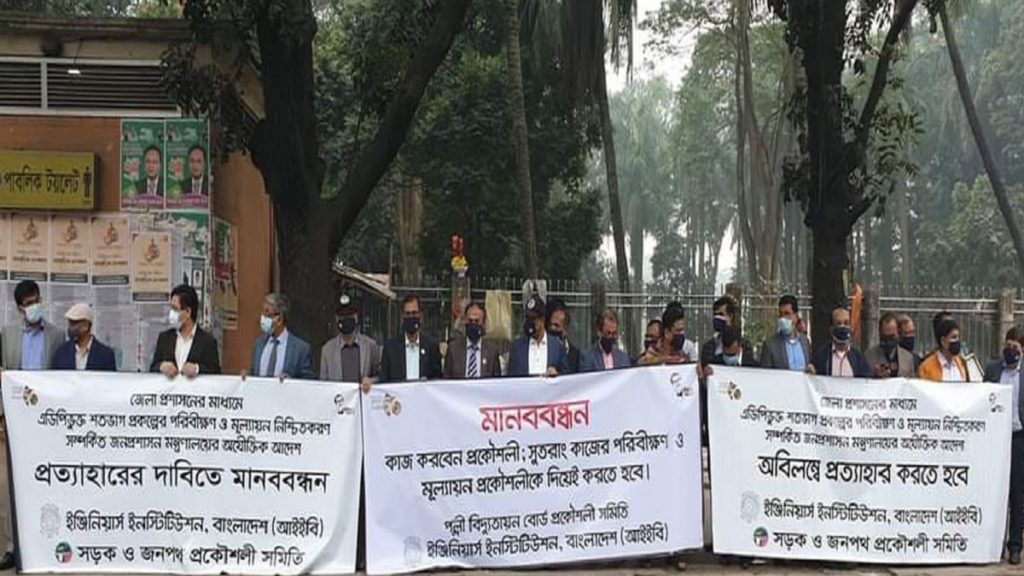 এডিপিভুক্ত প্রকল্পে জেলা প্রশাসকদের দিয়ে বাস্তবায়ন পরিবীক্ষণ ও মূল্যায়ন কমিটির জন্য জনপ্রশাসন মন্ত্রণালয় যে চিঠি পাঠিয়েছে তা বাতিলের দাবি জানিয়েছে প্রকৌশলীদের বিভিন্ন সংগঠন।