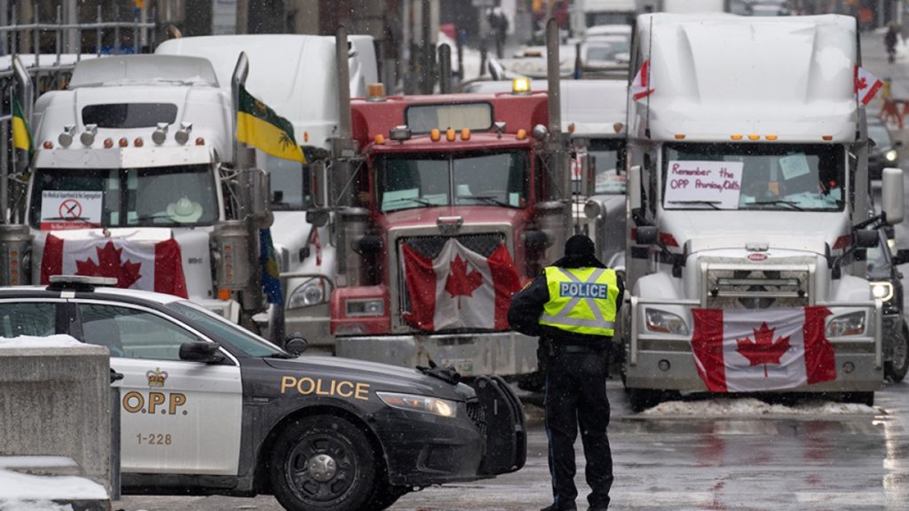 বিক্ষোভকারীদের অবরোধে যুক্তরাষ্ট্র-কানাডার মধ্যেকার ‘অ্যাম্বাসেডর ব্রিজে’র অচলাবস্থা নিরসনে তৎপর নিরাপত্তা বাহিনী।