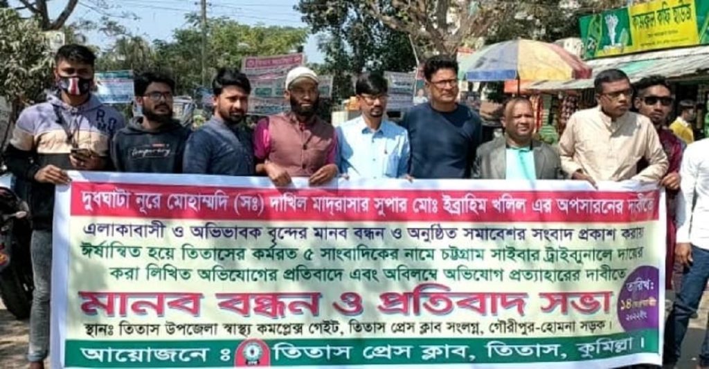 কুমিল্লার তিতাসের এক মাদরাসা সুপারের অনিয়ম-দুর্নীতির বিরুদ্ধে এলাকাবাসীর মানববন্ধন এমন সংবাদ প্রকাশের জের ধরে পাঁচ সাংবাদিকের বিরুদ্ধে চট্টগ্রাম সাইবার ট্রাইব্যুনাল আদালতে ডিজিটাল নিরাপত্তা আইনে মামলা করা হয়েছে। স্থানীয় সাংবাদিকরা এর প্রতিবাদে মামলা প্রত্যাহারের দাবিতে মানববন্ধন ও প্রতিবাদ সভা করেছেন।