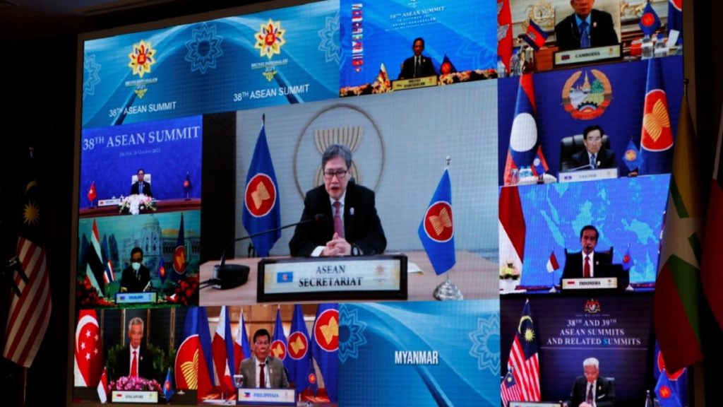 সদস্য দেশগুলো অভিযোগ জানায়, দেশে অভ্যুত্থানের মাধ্যমে জোটের নীতিমালা লঙ্ঘন করেছে মিয়ানমার সেনাবাহিনী। সে কারণেই, বিশ্বমঞ্চে কথা বলার অধিকার হারিয়েছে তারা। বর্তমানে, ১০ সদস্যের জোটটির মহাসচিব কম্বোডিয়ার প্রধানমন্ত্রী হুন সেন।