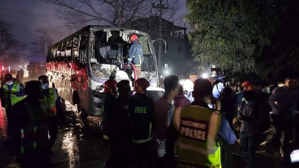একজন প্রত্যক্ষদর্শী জানিয়েছেন, বাসটি সঠিক পথেই ছিল তবে প্রাইভেট কারটি ওভারটেক করতে গিয়ে নিয়ন্ত্রণ হারিয়ে বাসটিতে ধাক্কা দেয়। এ সময় থেমে যাওয়া বাসটির পেছন থেকে আরেকটি লরি ধাক্কা দিলে বাসটি কারের ওপরে উঠে যায়। এর পরপরই বাসটিতে আগুন লেগে যায়।