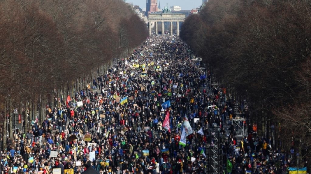 জার্মানির রাজধানী বার্লিনে যুদ্ধবিরোধী বিক্ষোভে যোগ দিলেন প্রায় ৩০ হাজার মানুষ। রোববার (১৩ মার্চ) ছিল বিশাল এই আয়োজন।