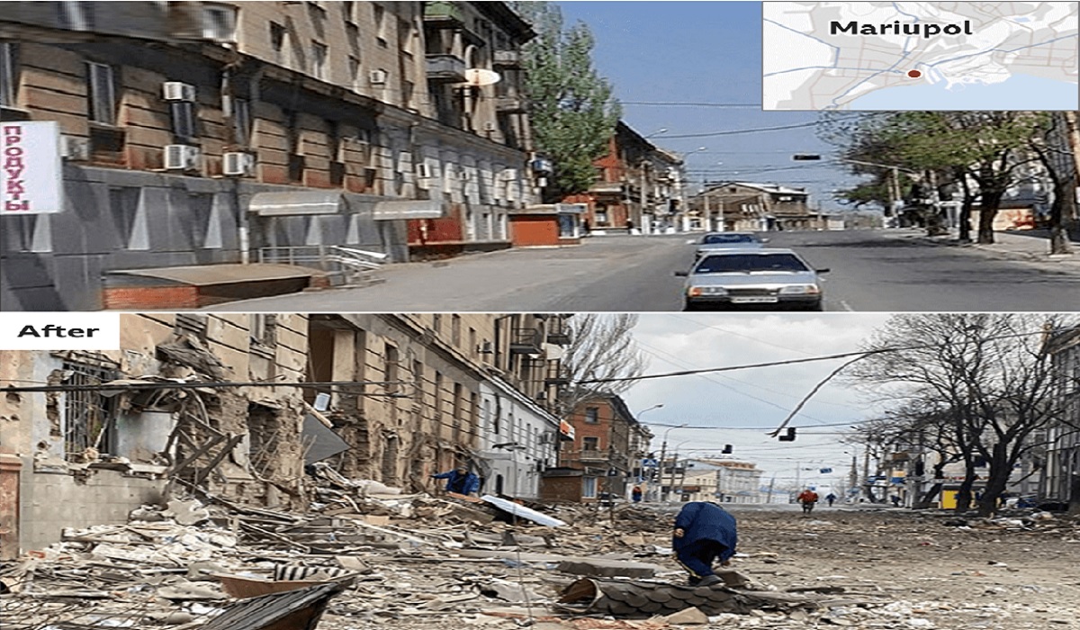 রুশ হামলার আগে ও পরে মারিওপোলের রাস্তা। ছবি: সংগৃহীত