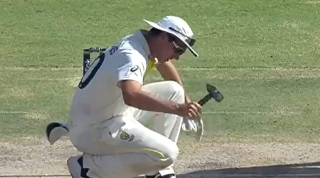 অস্ট্রেলিয়া-পাকিস্তান টেস্টের চতুর্থ দিনে হাতুড়ি দিয়ে পিচে বাড়ি মারতে দেখা গেছে অজি অধিনায়ক প্যাট কামিন্সকে। এই ভিডিও এরইমধ্যে ‘থর’ কামিন্স নামে ভাইরাল হয়েছে নেট বিশ্বে।