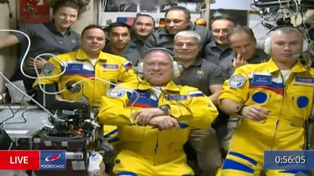 ইউক্রেনের পতাকার রঙে পোশাক পরে আন্তর্জাতিক মহাকাশ স্টেশনে হাজির হয়েছেন তিন রুশ নভোচারী। ইউক্রেনে রুশ আগ্রাসনের প্রতিবাদস্বরূপ নিজেদের অবস্থান পরিষ্কার করেছে নভোচারীরা, এমনটাই ধারণা করা হয়েছে বিবিসিতে প্রকাশিত খবরে।