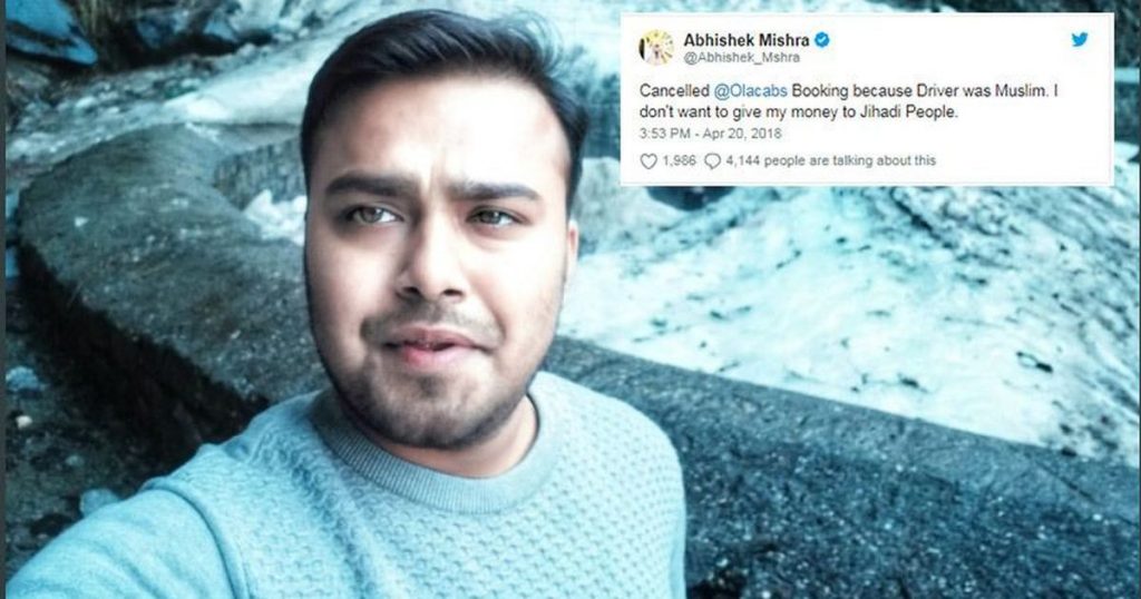 ২০ এপ্রিলের টুইট করে তিনি জানান, চালক মুসলিম বলে ওলার বুকিং বাতিল করেছেন তিনি। সাথে এও লেখেন, তিনি জেহাদিদের পয়সা দিতে চাননা! এরপর মিশ্রর এই টুইট নিয়ে পক্ষে বিপক্ষে প্রতিক্রিয়া আসতে থাকে। অনেকে টুইটার এবং ওলায় অভিষেকের অ্যাকাউন্ট বাতিলের দাবি করেন। আবার কেউ কেউ তাকে সমর্থনও করেছেন।