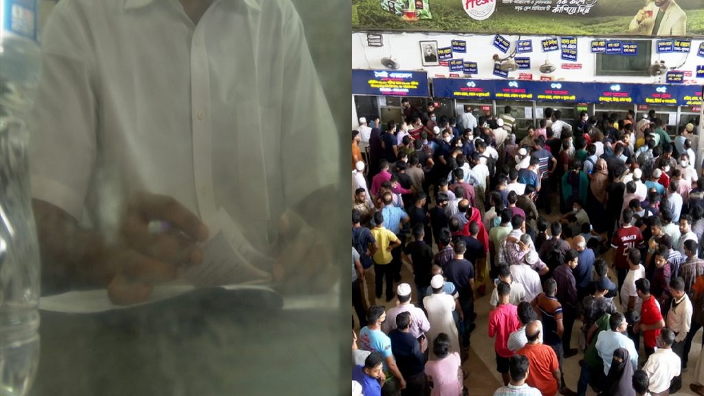 বৃহস্পতিবার (২৪ মার্চ) রাজধানীর কমলাপুর রেলস্টেশন ঘুরে দেখা যায়, ঘণ্টার পর ঘণ্টা দাঁড়িয়ে থাকার পর মিলছে রেলের টিকেট। অনলাইনে টিকিট বিক্রি বন্ধ, কাউন্টারেও কম্পিউটারাইজড কার্যক্রম বন্ধ। টিকিট দেয়া হচ্ছে হাতে লিখে। একটি টিকিট দিতে জনপ্রতি লাগছে ১০-১৫ মিনিট সময়।