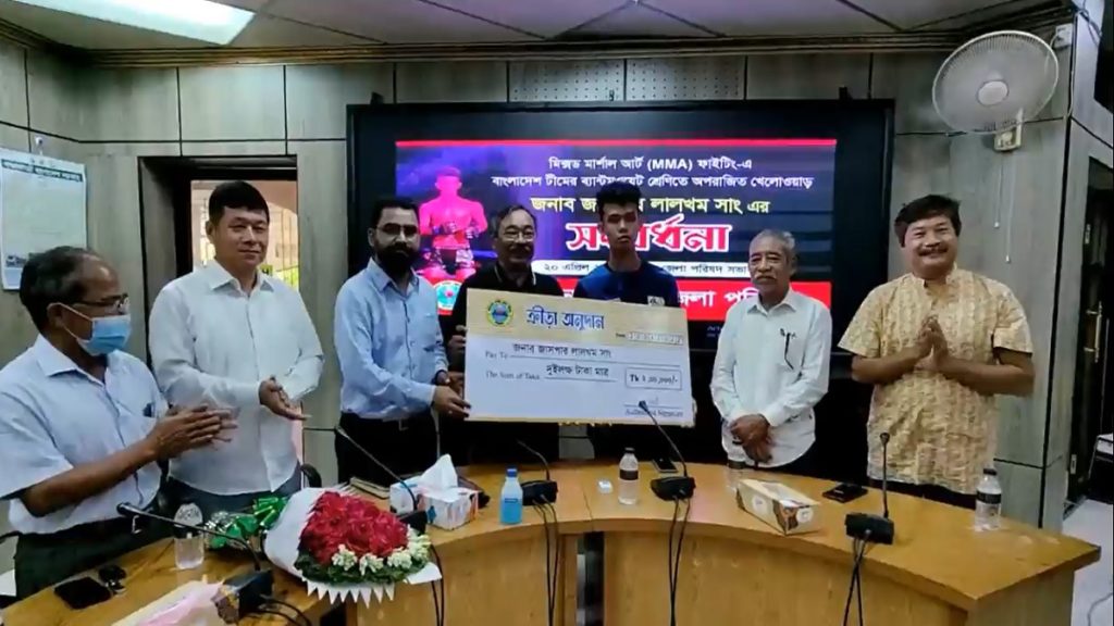 মিক্সড মার্শাল আর্ট ফাইটিং এ বাংলাদেশ টিমের ব্যান্টমওয়েট শ্রেণিতে অপরাজিত চ্যাম্পিয়ন হওয়ায় বান্দরবান জেলার দুর্গম রুমা উপজেলার বম সম্প্রদায়ের জাসপার লালখম সাংকে সংবর্ধনা দেয়া হয়েছে।