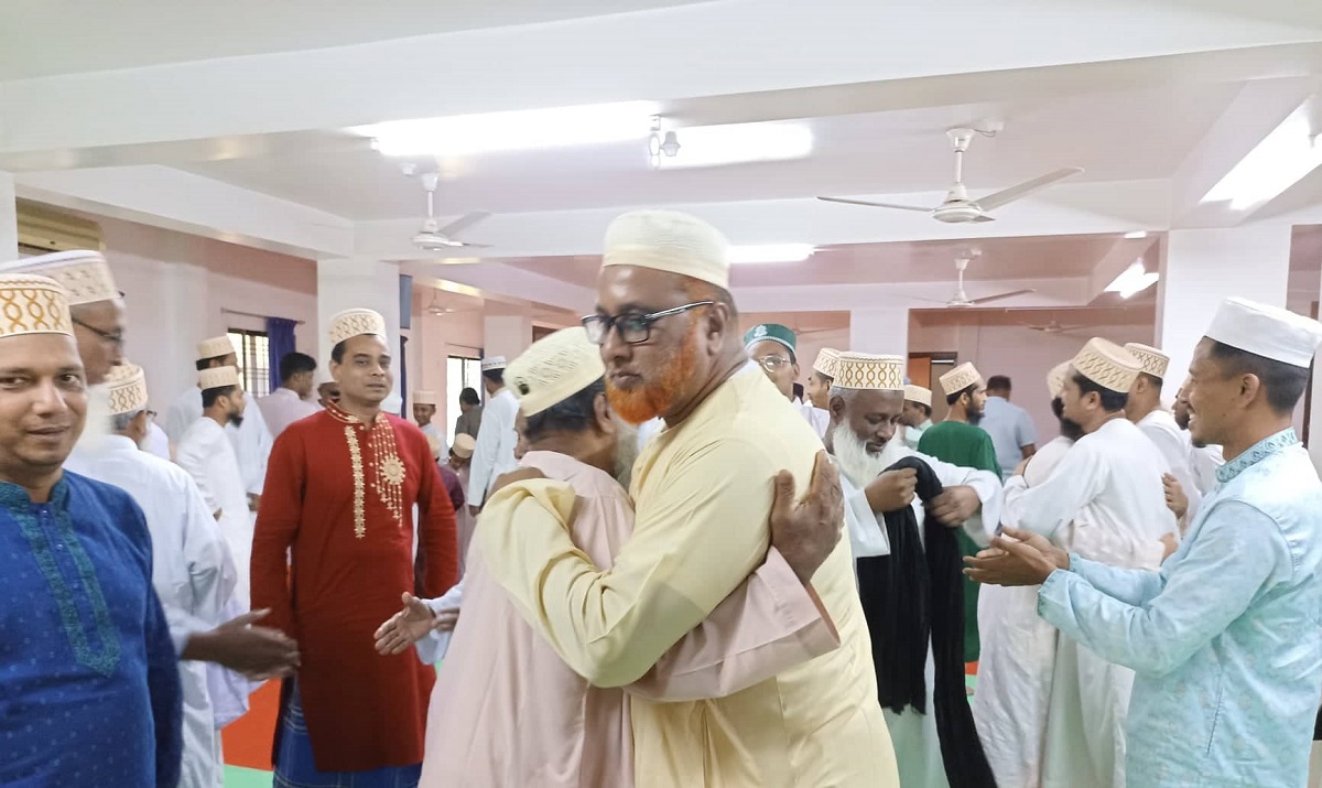 ঈদের নামাজ শেষে মুসল্লিরা একে অন্যের সাথে কোলাকুলি করেন।
